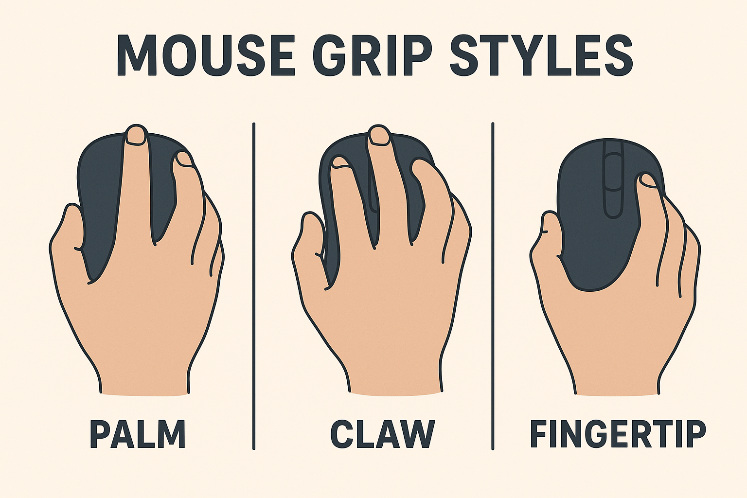 Your grip style affects which mouse shape is best for you. There are three main grip types: palm, claw, and fingertip.